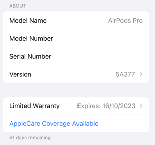 I bought the new Airpods Pro two days ago, on September 26. I thought I get a standard Apple limited warranty lasting one year. Then the Apple re-seller informed me that they give me one year more after that. However, here it states that it expires on October 16, 2023 and then, one line lower, that I have 60 days remaining (today it says 61 !?). Then there is the EU legislation that dictates 3 (three) years for items bought after January 1, 2022.