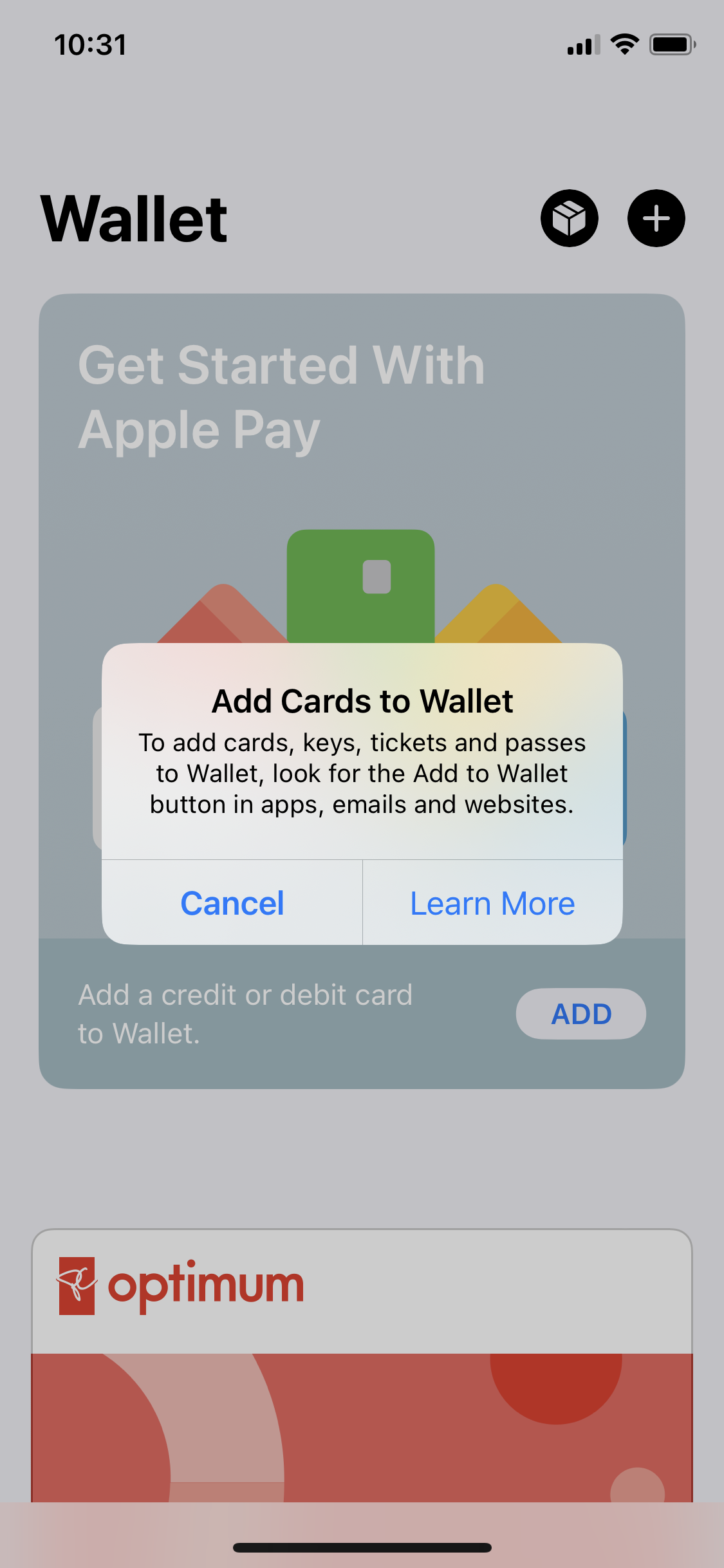 Whenever I click add card on Apple Pay there is a small window pop up I can see but it shows only two option that is cancel and learn more.