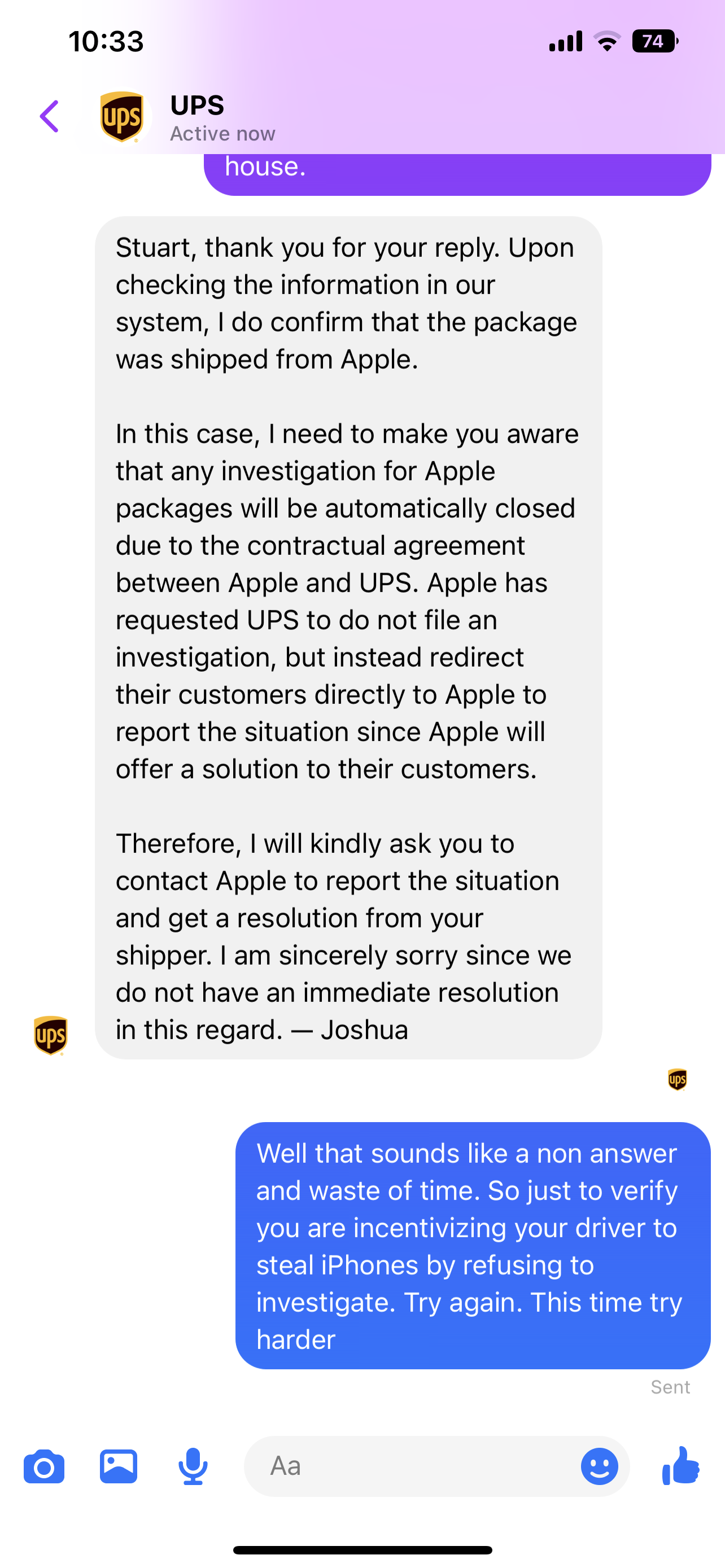 i followed the rules and order an iPhone on release day. Unfortunately Apple sent my phone via UPS. The phone made it from China all the way to the local delivery truck before someone decided to misappropriate my phone. Anyone else having similar issues?Apparently UPS incentivizes their people to steal apple devices and protects their drivers. UPS literally told me in a text response.