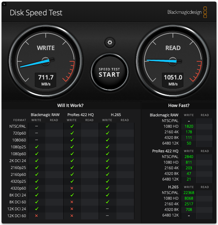 I am also using Blackmagic Disk Speed to test performance. Again sometimes good, sometimes bad.