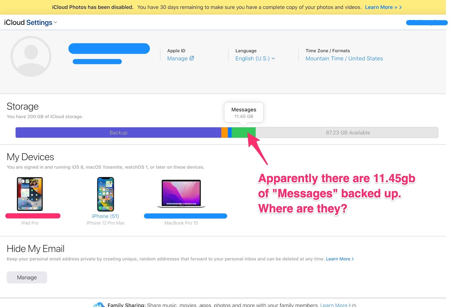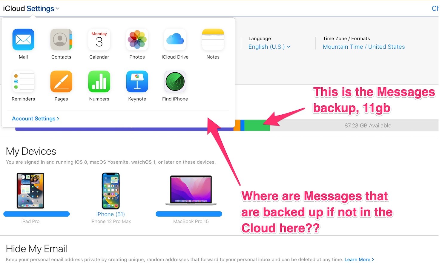 Specific question here is, logged into iCloud in my browser, it says I have 11.45 gigabytes backed up of "Messages."