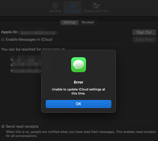 I bought an M1 MacBook Air and the Messages app won't sync with iCloud even though it was enabled. I tried disabling it first and then when I wanted to enable it again in the Messages settings, it just says "unable to update iCloud settings at this time". I've already disabled and re-enabled Messages in the iCloud settings on my iPhone, but it still didn't work. What's the solution here?
