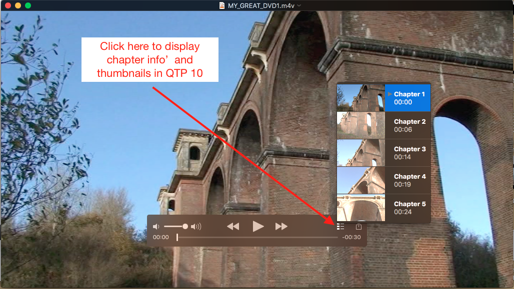 When playing the HandBrake output in QTP you can see the chapters( if they were present originally on the DVD) and you get a thumbnail of a scene to indicate the content.In my example the chapters were numbered 1,2,3 etc but what I can't remember, as I type this , is if in iMovie 9 when you create the chapters, you can give the chapter a description ,say Christmas Party, in place of a number 1,2 etc.