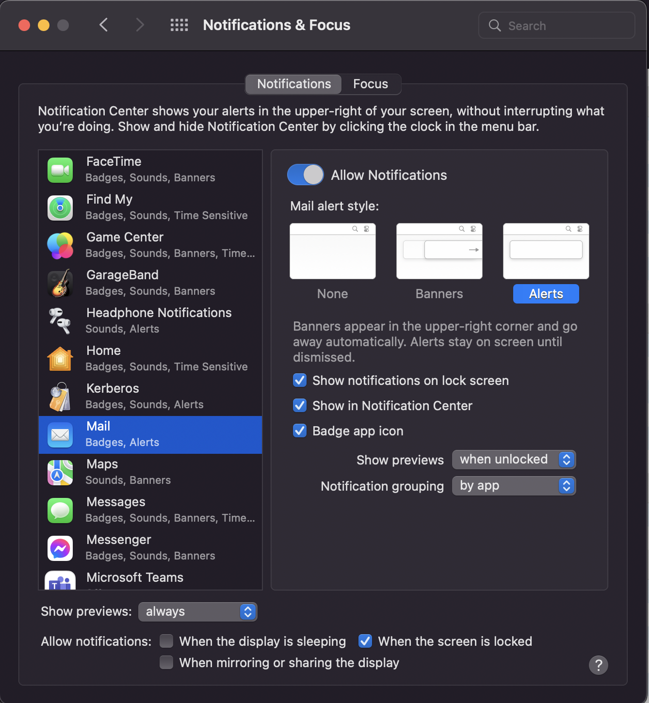 I have turned on notifications for emails on my Mac (running MacOs monterey), but only badges are shown when I receive an email, but I receive the notification on my iPhone first. I have attached a screenshot of my email notification preferences. I have not turned on Do not disturb mode.