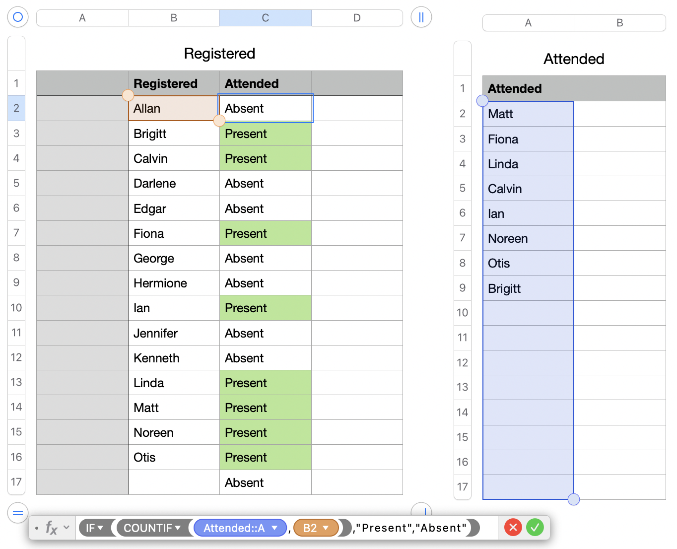 I have two tables: in **Table 1** I have the names of the students who registered for the examination, in **Table 2** I have the names who actually showed up for the examination.