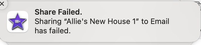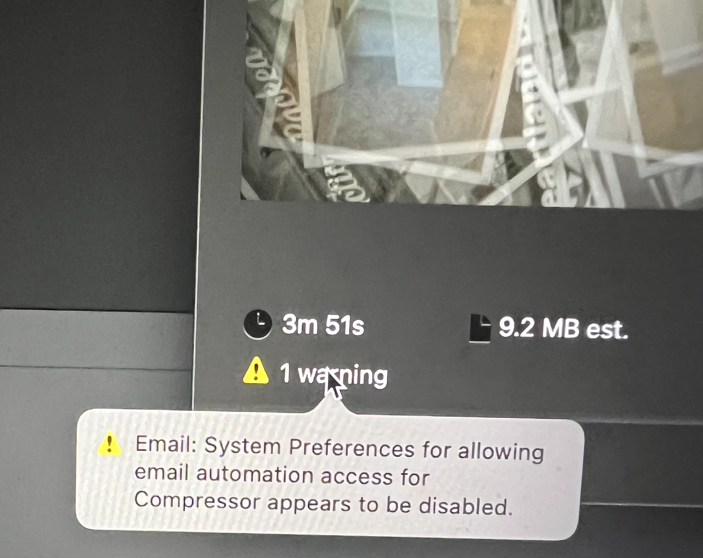 When using the iMovie app, and trying to (share) email an (slideshow movie), I instantly receive a yellow error message symbol with the following statement, (Email: System Preferences for allowing email automation access for Compressor appears to be disabled.)