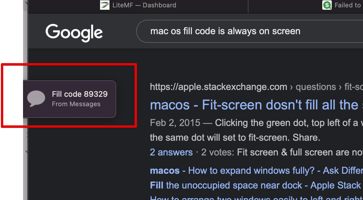 Sometimes the fill code from SMS stays on screen and does not go away. It is always on top and distracts me.
