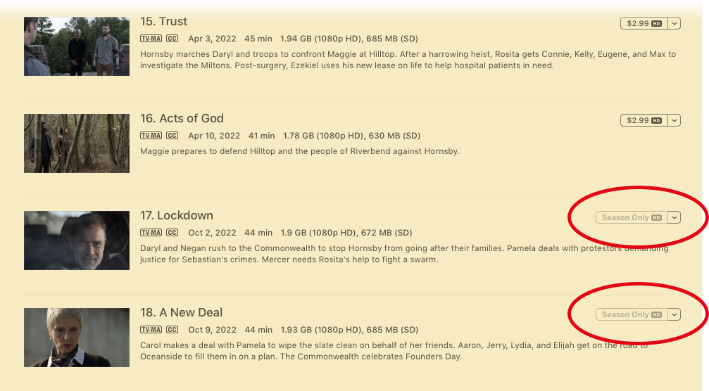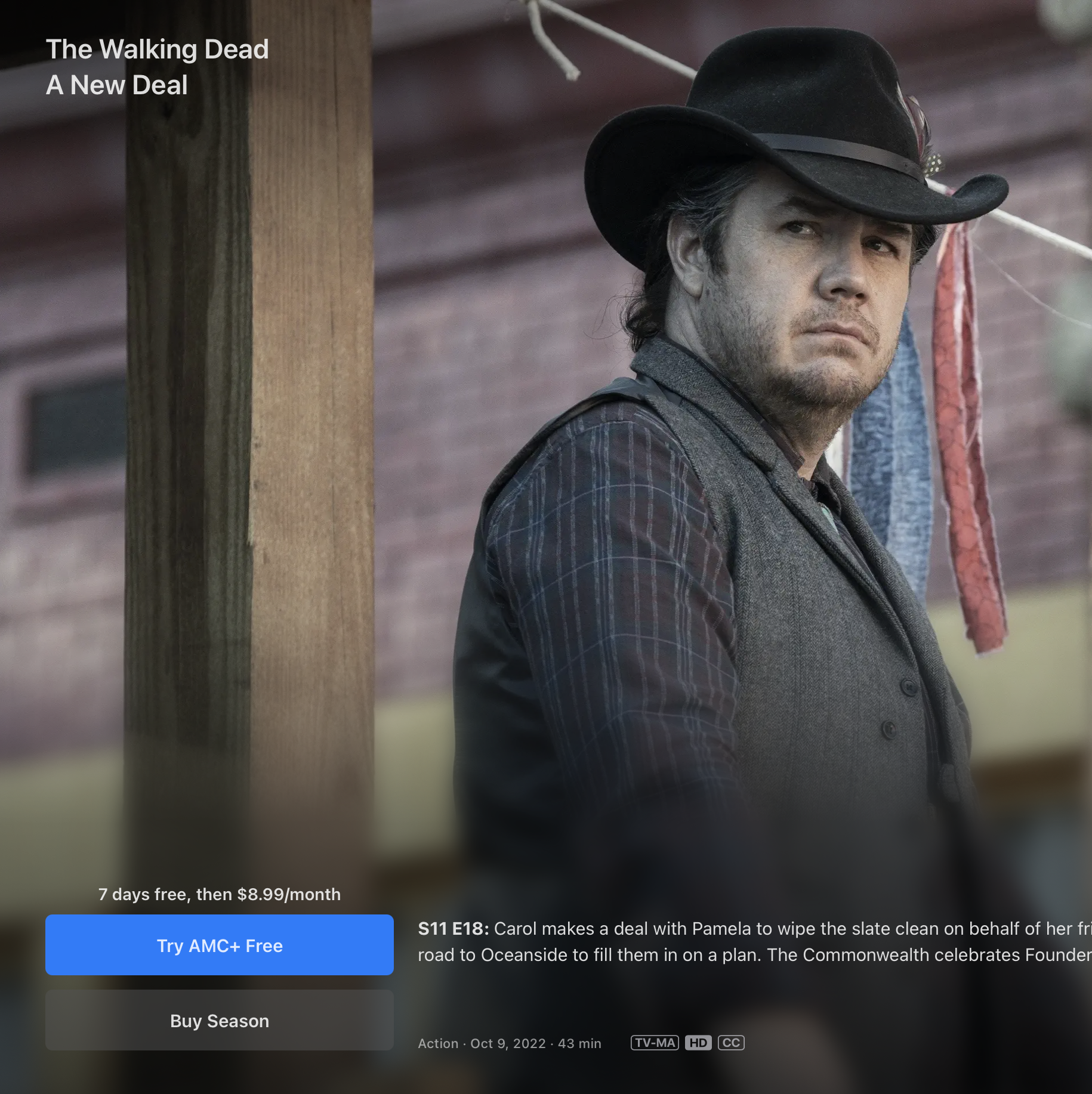I have purchased individual episodes of the Walking Dead with ease on iTunes. Once that was done away with, it's been a hassle to do the same thing in the TV app. THANKS APPLE! ) :< I have been able to do so previously on TV, but for some reason I can't now. The only 2 choices I see are "Try it for free" which is a prelude to buying a subscription which I don't want to do, or buy the season, which I don't want to do - because I have already watched a bunch of episodes. Today is Oct. 11, 2022. The episode aired on the 9th, so I should be able to buy it. Someone please deliver me from this aggravation......
