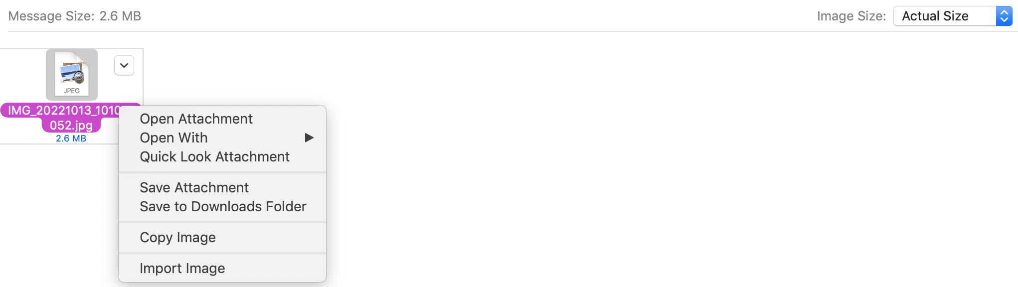 What's the fix for attached images not displaying when composing a new Mail message? Notice that the "View in Place" and "View as icon" is missing from the context menu. Now, if the message is saved as draft then the image will show in the mail preview window, but opening the message composing window will not show the image inline. Received messages also have the context menu option for either icon or image.