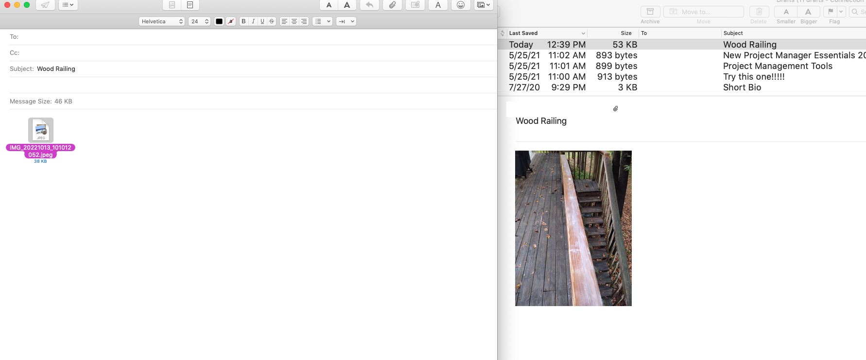 What's the fix for attached images not displaying when composing a new Mail message? Notice that the "View in Place" and "View as icon" is missing from the context menu. Now, if the message is saved as draft then the image will show in the mail preview window, but opening the message composing window will not show the image inline. Received messages also have the context menu option for either icon or image.