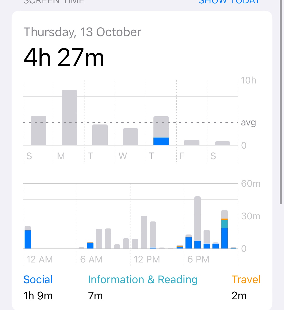 My screen time with iPhone 14 pro was showing a much higher time than the actual usage. It was showing usage even when I was driving (it wasn't connected to carplay). This usage was show as a grey bar on the screen time graph. I assumed that this was due to the "Always on display" so i turned it off. And i was correct: my screen time dropped significantly and the grey bars almost vanished.