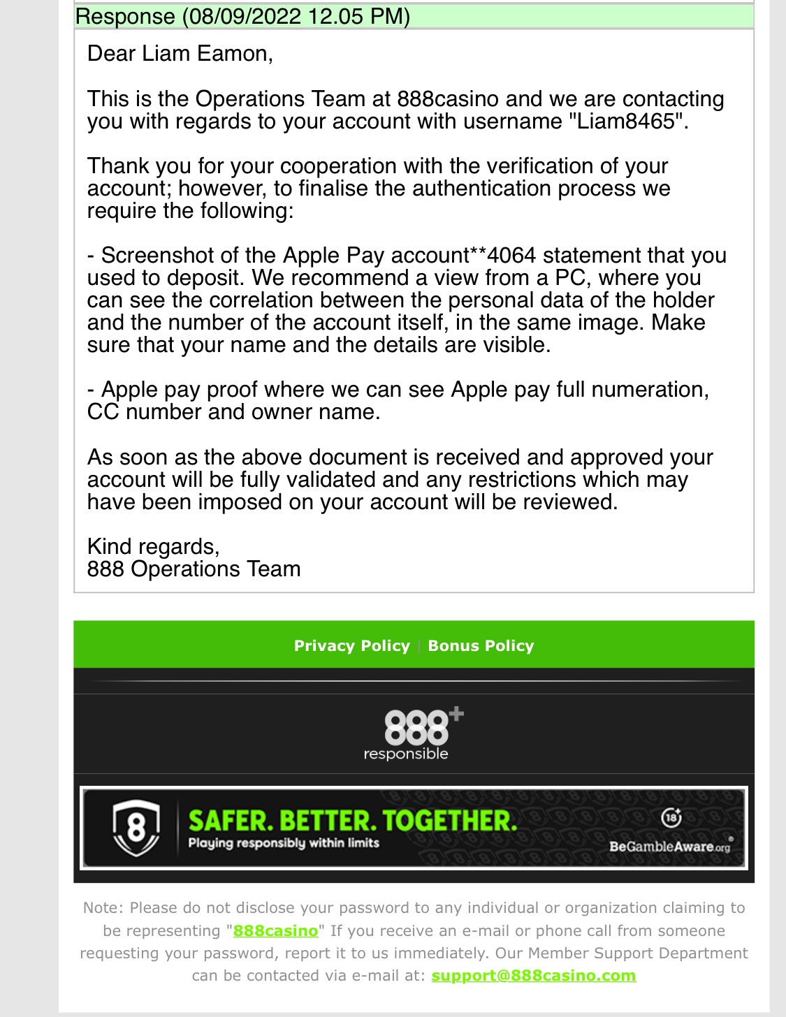 since changing my phone 888 casino have been in touch for me to verify the Apple Pay account I was previously using was in fact mine and are insisting I show them proof of device number ect.