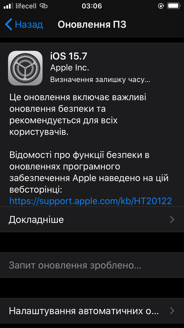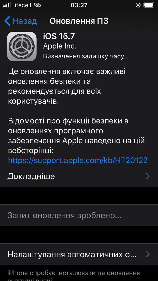 Can't update Software settings for Apple ios 15.7, still waiting few hours, but there is good internet connection and enough space. Phone is using in Ukraine, Lviv.