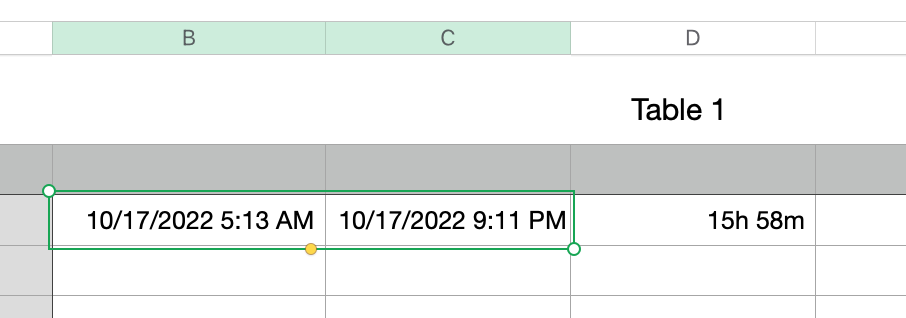 Here's an example,using the times you supplied, starting 'today' (Oct 16) and ending early 'tomorrow' (Oct 17), and entering both Time and Date parts of the start and end times (in row 2), but only the Time parts of those Date and Time values on row 3. In both lines, the start and end times were entered on the same date (Oct 16).