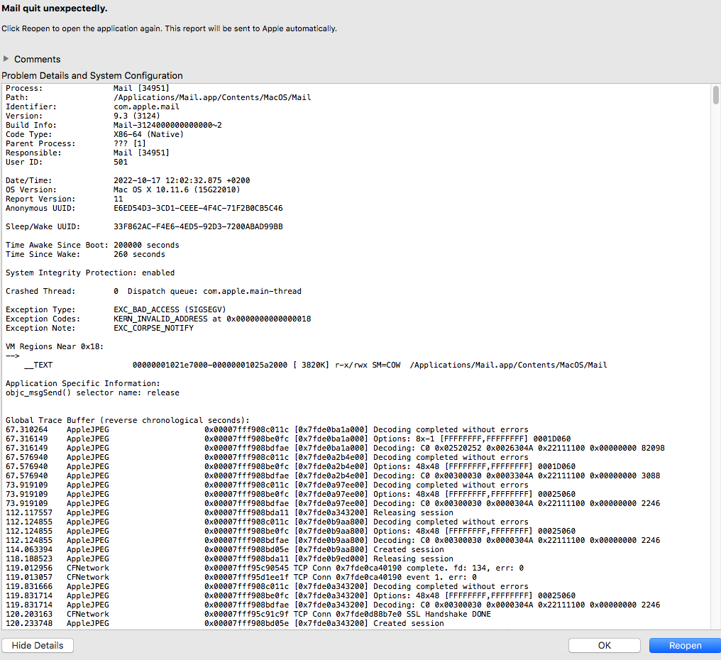 Apple Mail started crashing when a gmail account is opened.