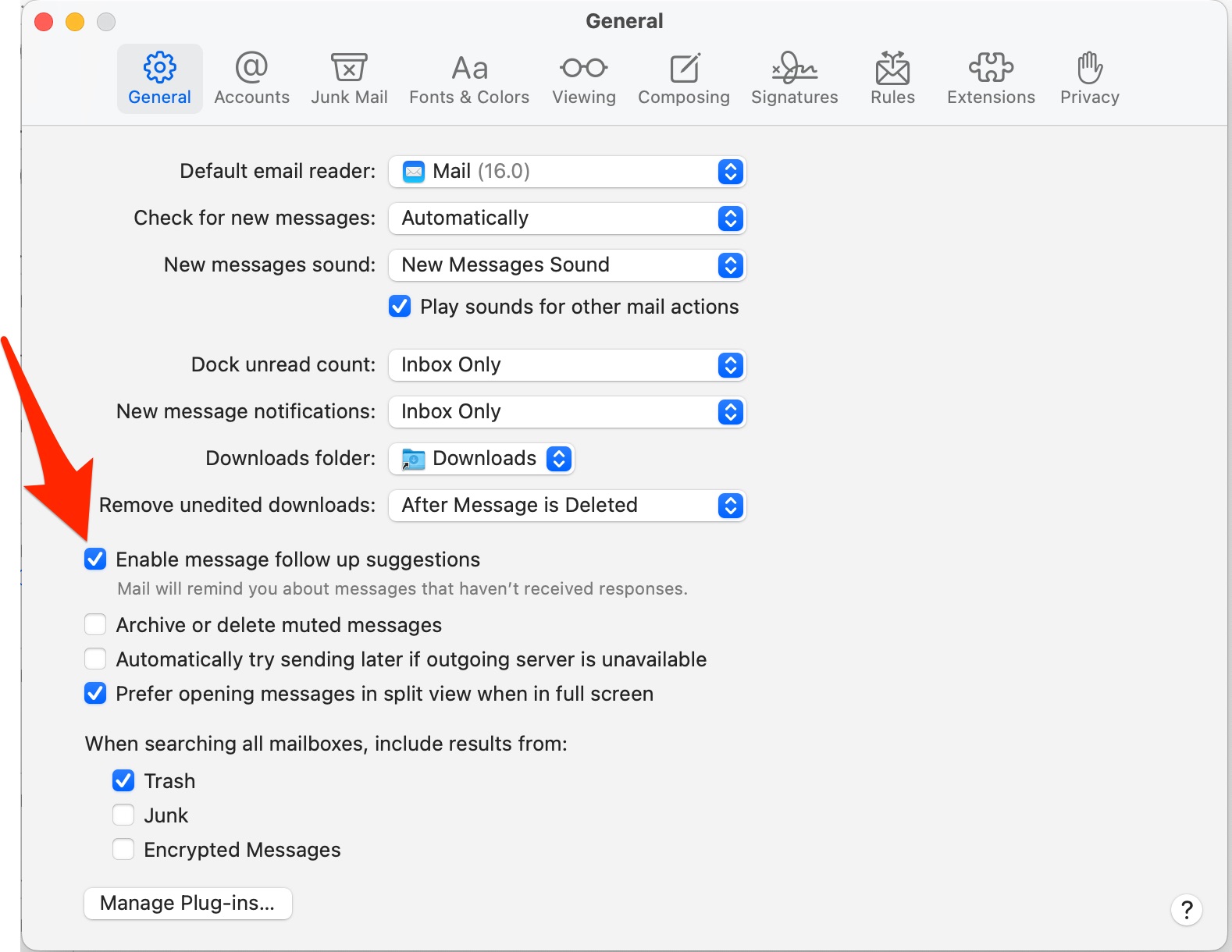 3) On the General tab you will see the option to check or uncheck "Enable message follow up suggestions"