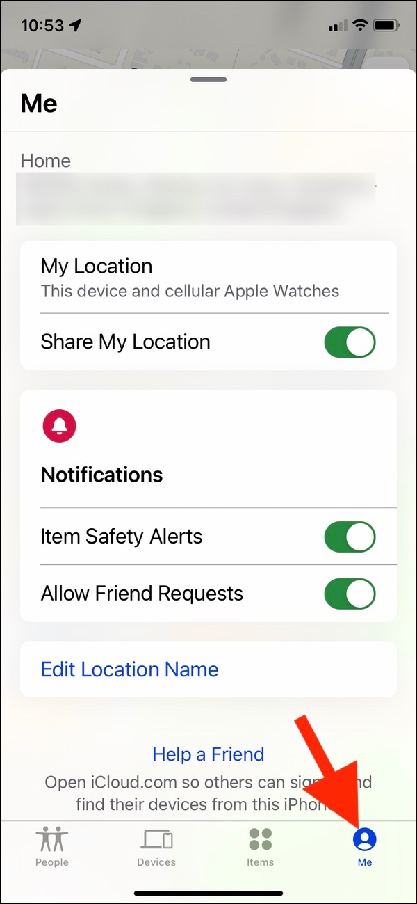 Open the Find My App, tap on the Me tab, and then scroll down the bottom and tap on "Help a Friend".