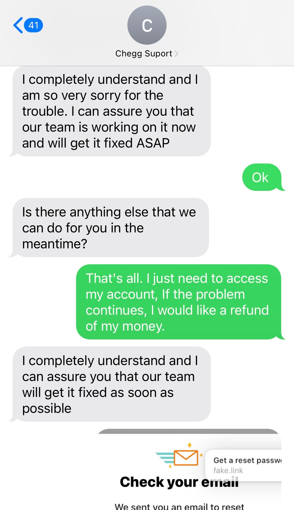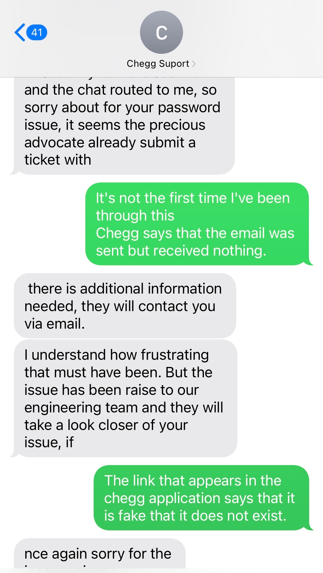 The message that appears in the chegg provides a link to change the password and be able to restore the account, the problem is that the link it provides is false and it is a problem that chegg has had for a long time. I tried many times but nothing. I decided to communicate with chegg through a number that they provide a line of text messages. They informed me that it was a server error and that they were working on them, that it would take a few working days to fix it. The days go by and they don't fix anything, I communicate with them and they say the same thing.