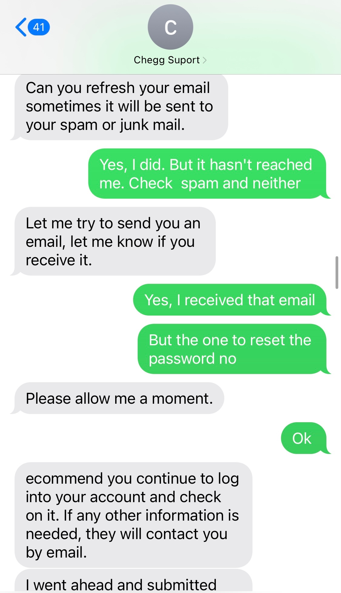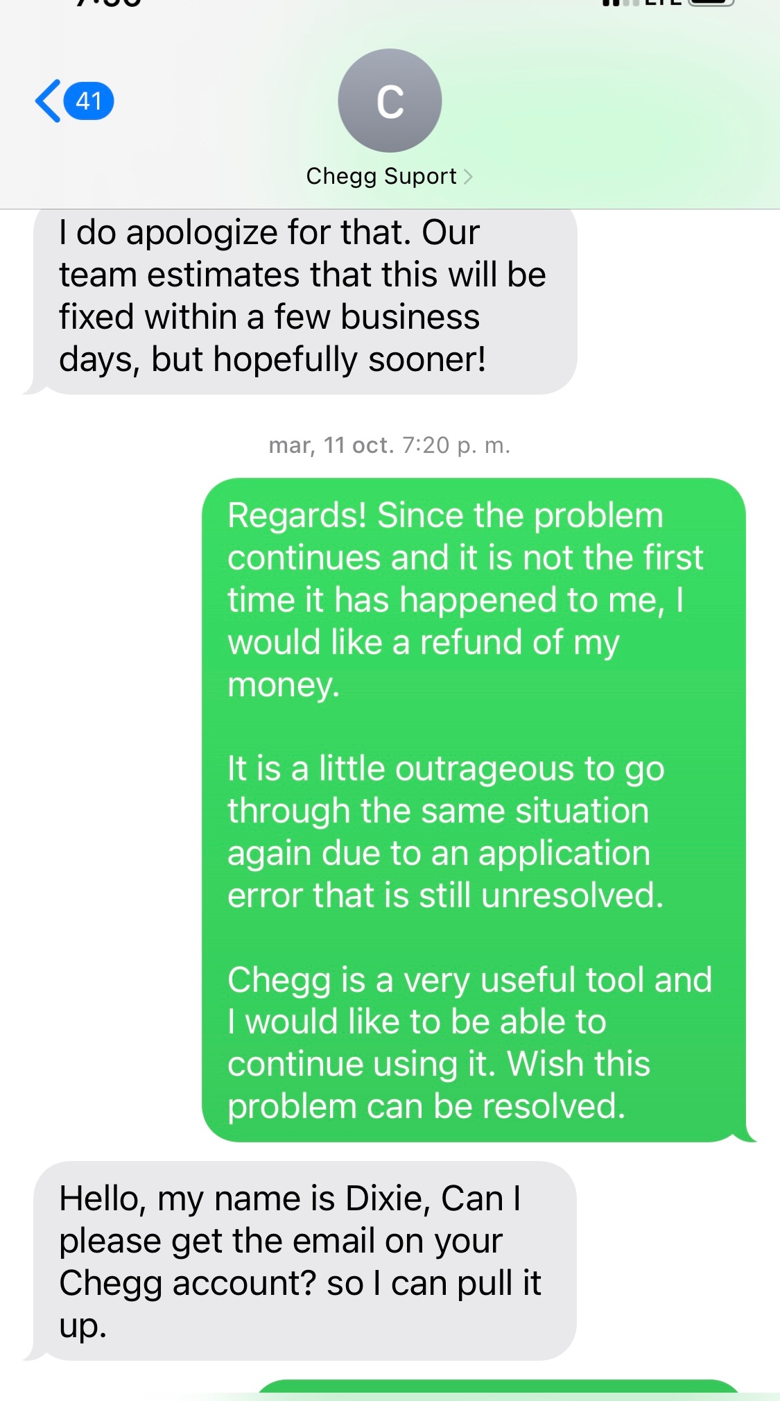 Because they couldn't or have solved the problem, I decided to make a claim for my money since I paid for something that I have not been able to use. They notified me that the claim had to be made with you. I made 4 complaints and 3 of them were contacting you Apple at (800) 692-7753 and (866) 676-5682. With your help, make the last 3 claims. They were all rejected, and one of those who helped me notified me that Chegg is the one who is denying relations. He considered that this is a scam and that you should support me more in this situation since I want my money back. And I will filing a complaint with the daco offices.