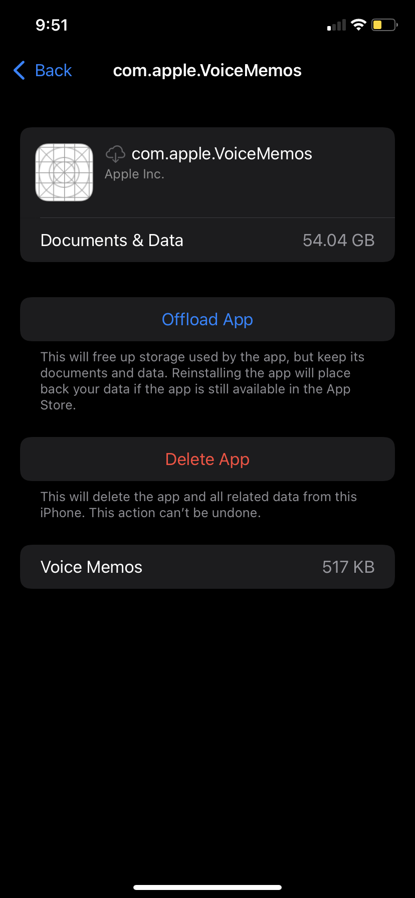 serious storage problem on my xr. There’s a mysterious file in iPhone Storage with 54GB that simply refuses to delete. It seems to be the voice memos files, although I removed that app. it still takes up 54 GB of space in Documents and Data. It still remains in General > iPhone Storage and is called "com.apple.VoiceMemos" with a cloud and downward arrow next to it. it’s slowing my phone down. I tried Turn off iCloud syncing for the Voice Memos app before deleting the app to remove them from your Phone.