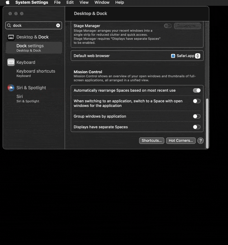 Dock & Menu Bar Settings page not fully visible