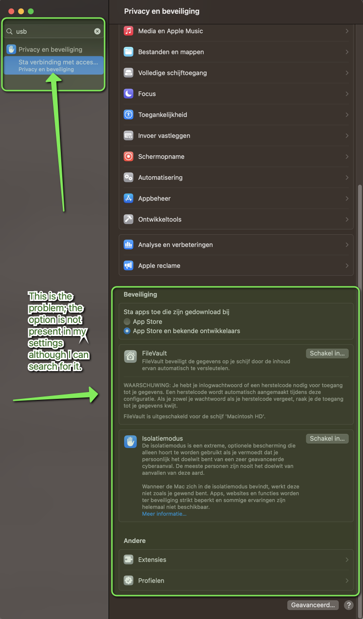 I’ve allowed accessories to connect (setting is set at “Always” in System Preferences > Privacy & Security), and the OS asked me if i wanted to allow some USB peripherals to connect to the macbook.