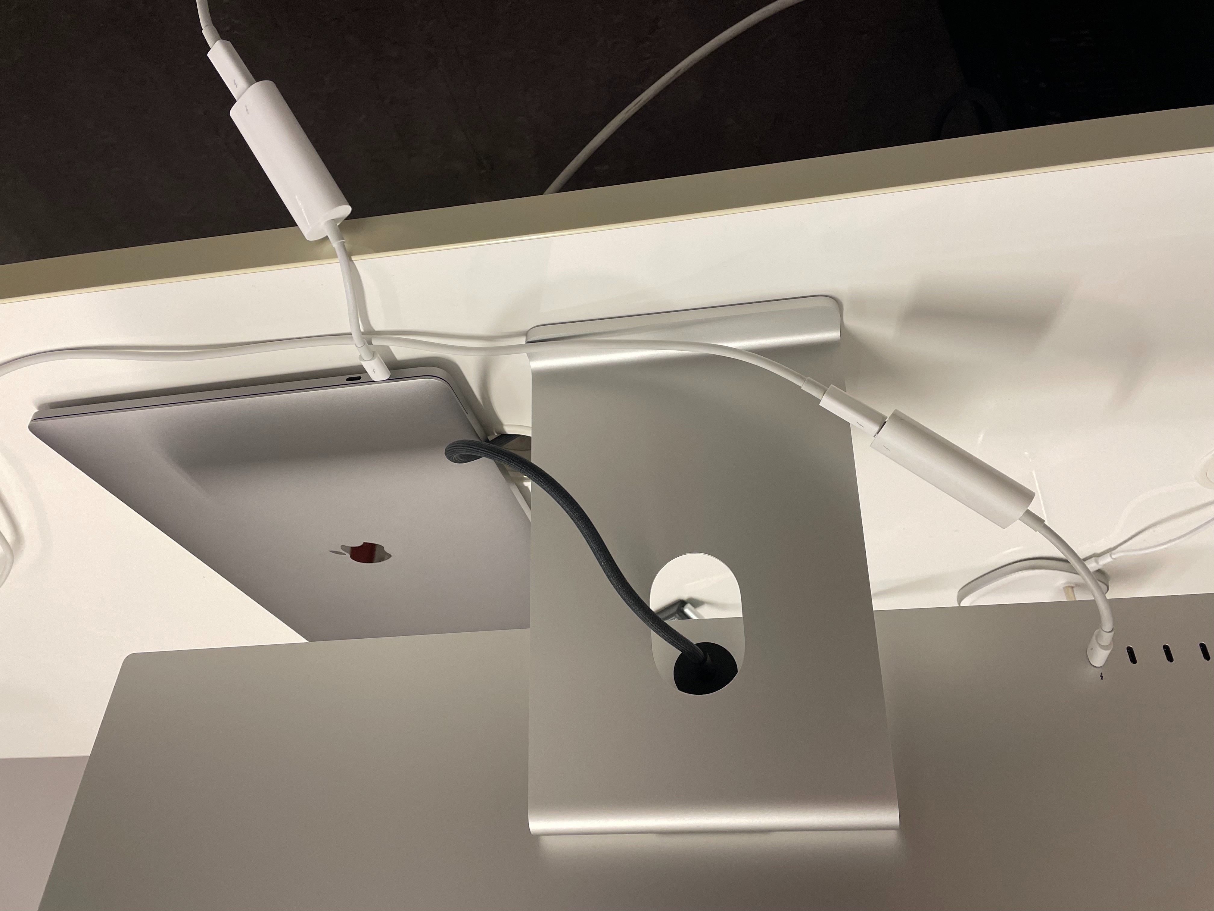 It has a thunderbolt 3 cable going into the Spectrum, and on the hub I have: a logitech dongle for a wireless headset, an usb-c webcam plugged in in the usb-c port, and usb hub from anker in the last usb A port, which powers mouse, keyboard, and external mic.