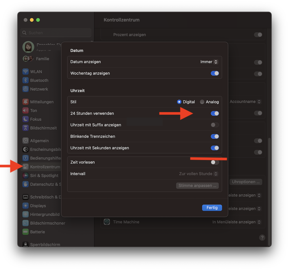 There are two settings for 24hours in the System Settings, one in Date&Time, and one in Control Center > Clock, far down at the bottom of the Control Center settings, Menü bar only: Click the Options for Clock.