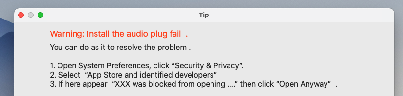 I download an app called Greatdy Computer Audio Device. The app runs fine. However, there is a button on it that says "click to install driver". When I click it is where I get the error message. So it isn't the app that has the issue, it's with the Mac OS not allowing the app to install a driver or plugin.