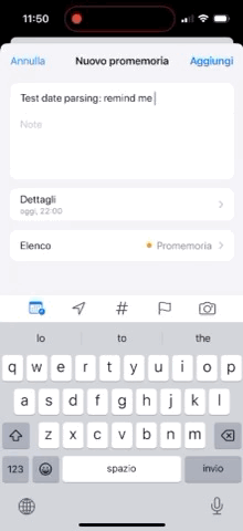 I'd like to know if this is kind of a limitation related to the Italian language I'm using on my iPhone. Basically when entering a new reminder in the Reminders app I'm using a lot the "smart date parsing" (not sure how I should call it), the feature when you type in a date / time within the new reminder's box, it automatically converts it to the related alarm. This is actually working fine, but the actual date/time text doesn't get removed from the reminder description while I saw somewhere else it should get removed instead. Is it by design, or is there a setting that should be changed in order for this to work as expected ?