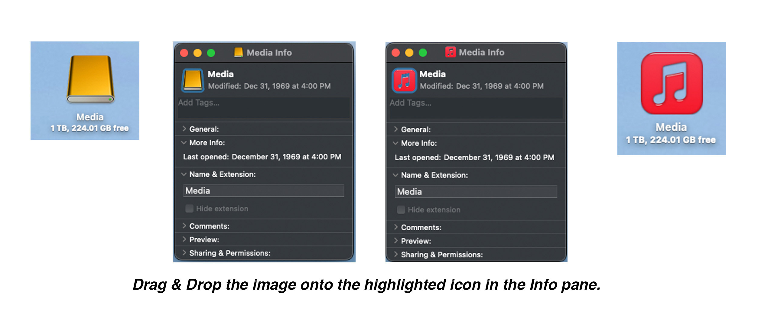 Some tips. PNGs work best for custom icons. They need to be square (256 X 256 for example). And CMD+C - CMD+V doesn't work anymore. I was totally frustrated by the process, till I learned that. Simply dragging the icon does it.
