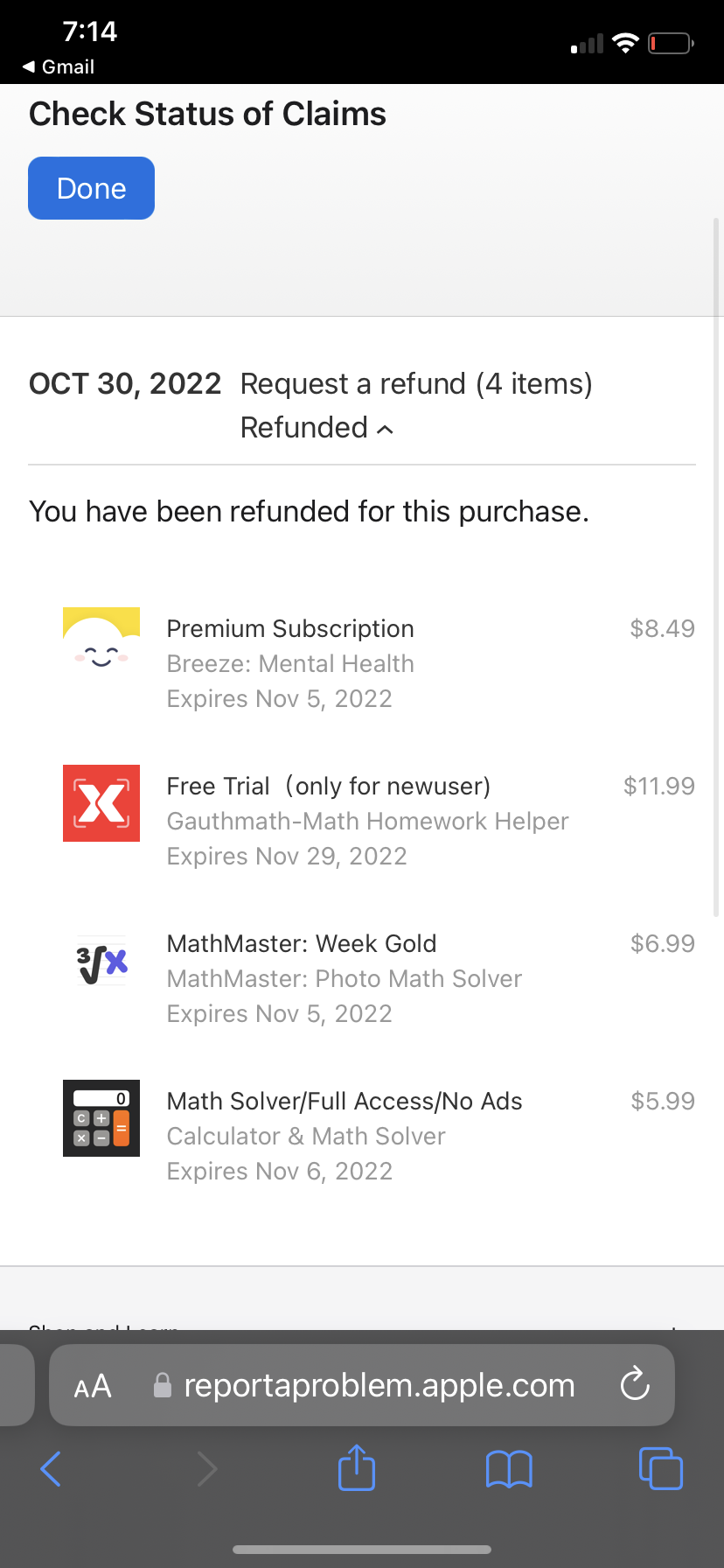 I was charged $33.46 for apps I deleted but it still says I have a subscription. I made a claim, It says I have been refunded, but I still have not gotten a refund. I should’ve gotten $33.46 back towards my apple cash.
