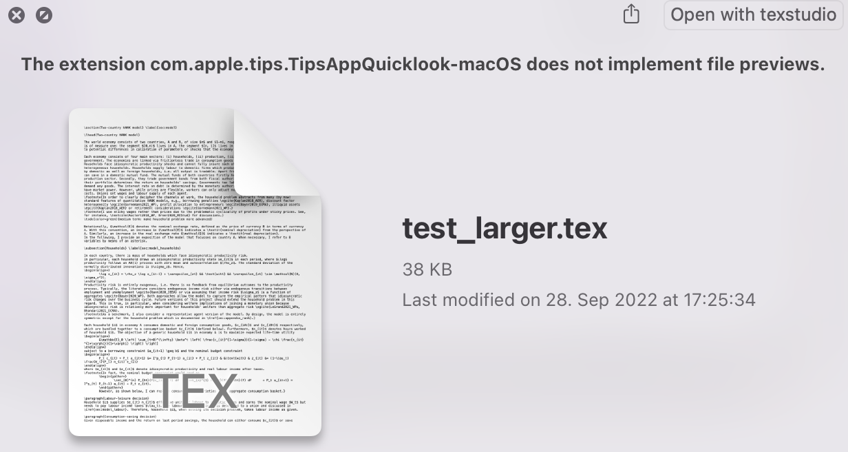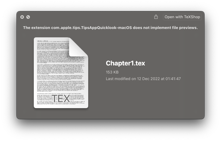 We have obviously been talking completely passed one another. I never wanted rendered TeX — I just wanted quicklook of the source! Prior to Ventura, this was successfully handled by some application, perhaps TextMate. In Ventura (on my machine at least) the "icon preview" for *.tex files still correctly showed a snippet of the source, but the "quicklook window" preview -- which used to show the source -- subsequently just showed the dialog at the top, including the (at best misleading, but possibly buggy and broken) "tipsAppQuicklook" message.
