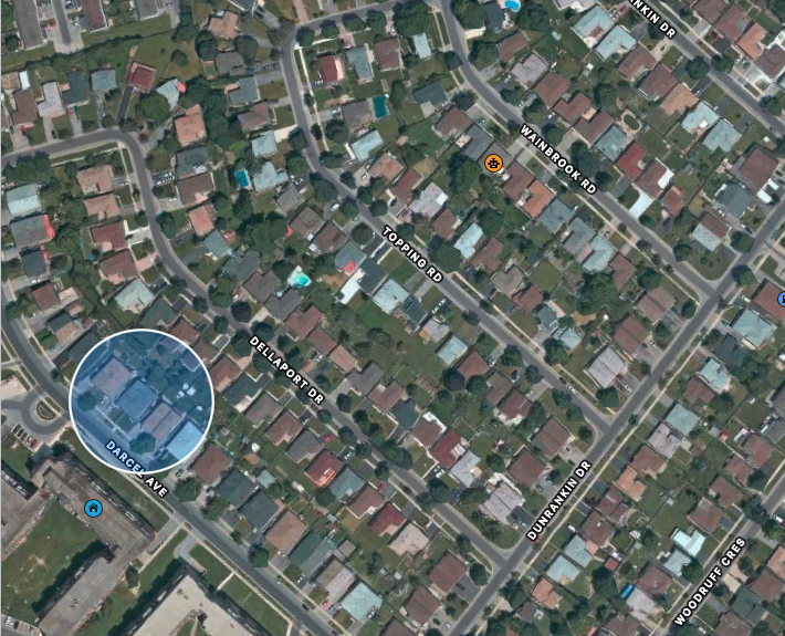 The satellite view shows the aerial imagery but with no street names and minimal labeling.