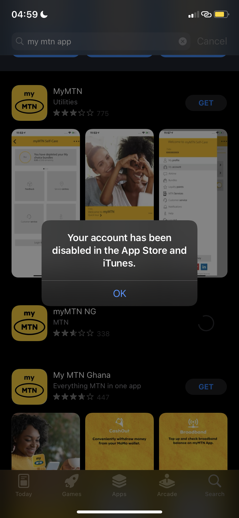 If you see a message that says 'Your account has been disabled in the App Store and iTunes'