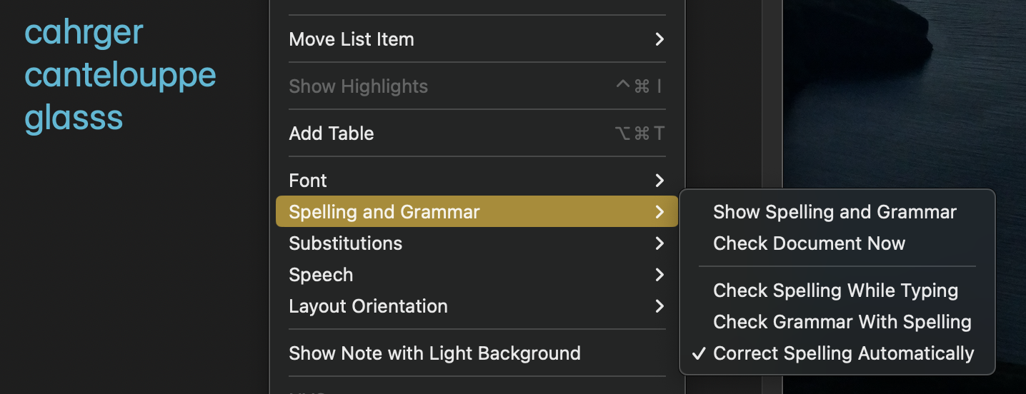 For illustration, the screenshot below shows me right-clicking on a Note with the misspelled words: cahrger, cantelouppe, and glasss. The "Correct spelling automatically" setting is checked.