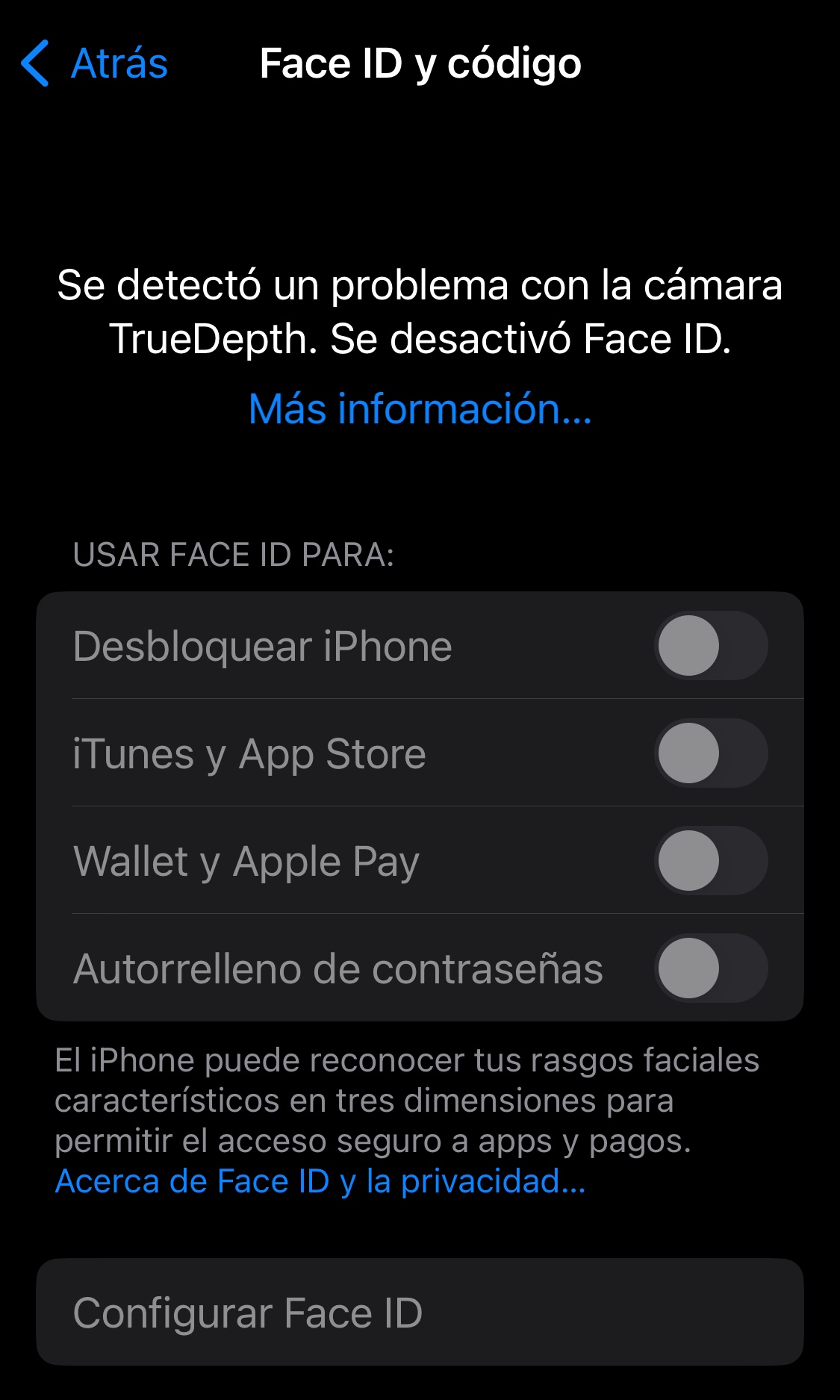 No funciona el face ID, ya intenté actualizar el sistema, revisar la cámara frontal y nada. Su apoyo para la solución de este problema.