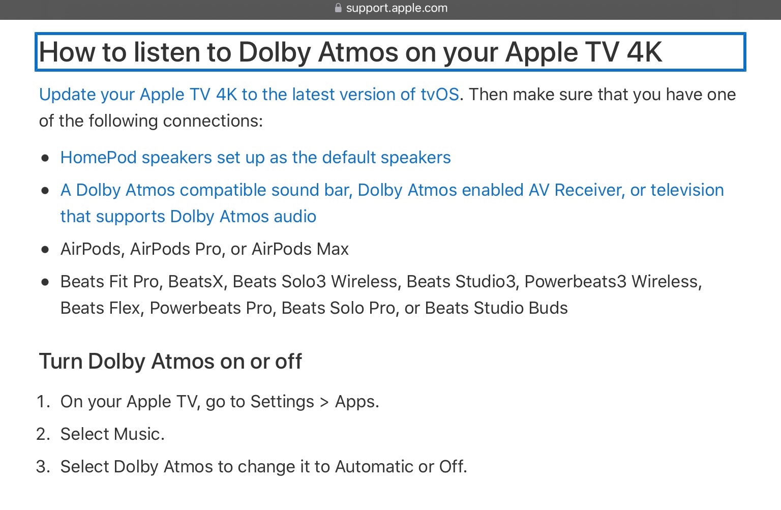I would agree that the Music App is bit of a black box when it comes to high resolution formats, Atmos, device compatibility, external DACs, specs etc. Use Feedback - Apple TV - Apple.