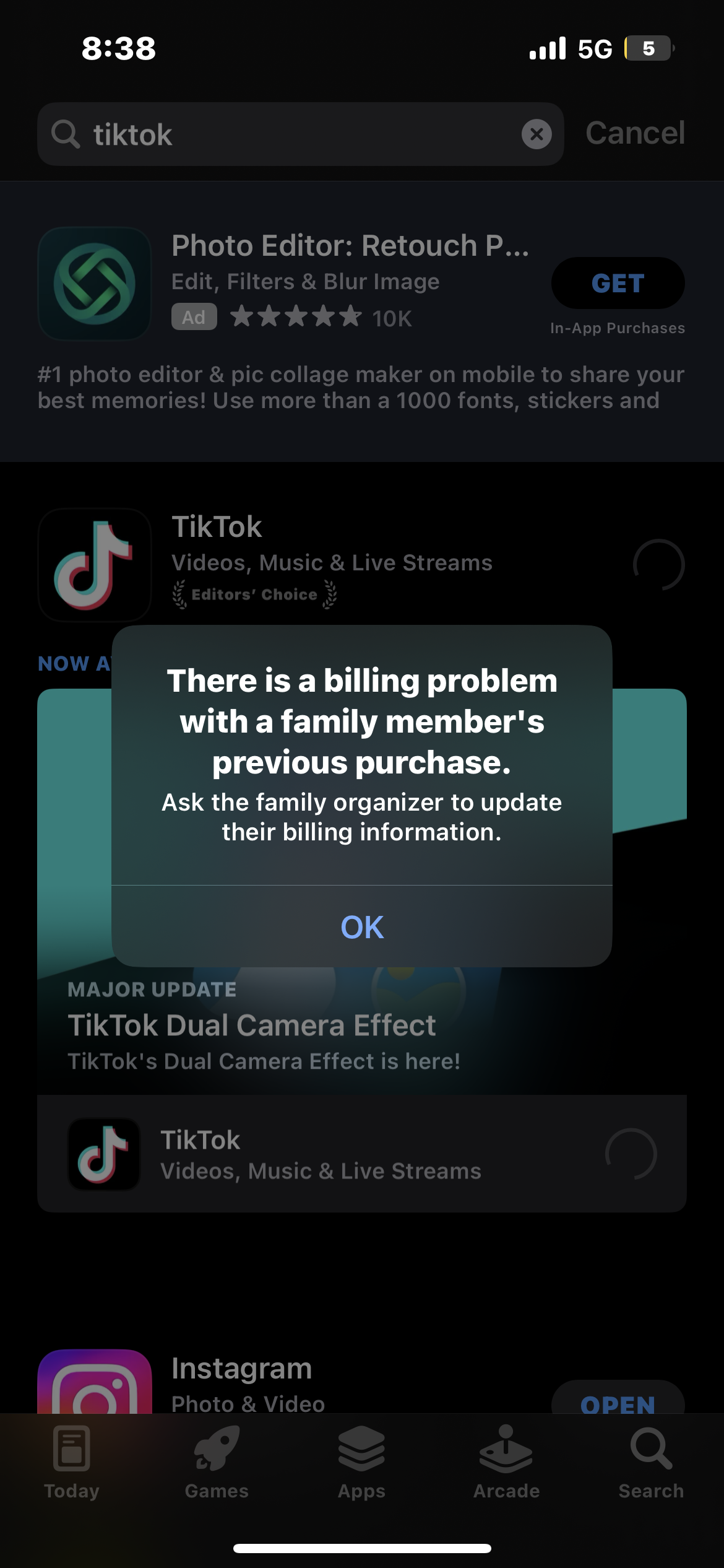 "There is a problem with a family members previous purchase: I have tried many different things like logging out of my App Store and logging back in and changing the cards that are on my family thing yet it keeps showing something whenever i try to download apps that i have had before and it shows this message. Does anybody know how to fix this?"
