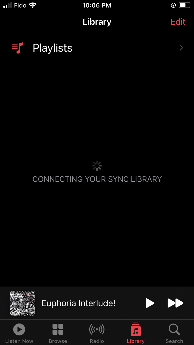 my phone’s apple music can’t connect to sync library. I left it loading for more than 5 hours and nothing changed.