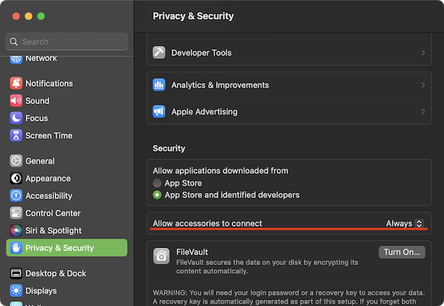 I cannot access the "Allow Accessories" section within the System Settings --> Privacy & Security section. See screen shots.