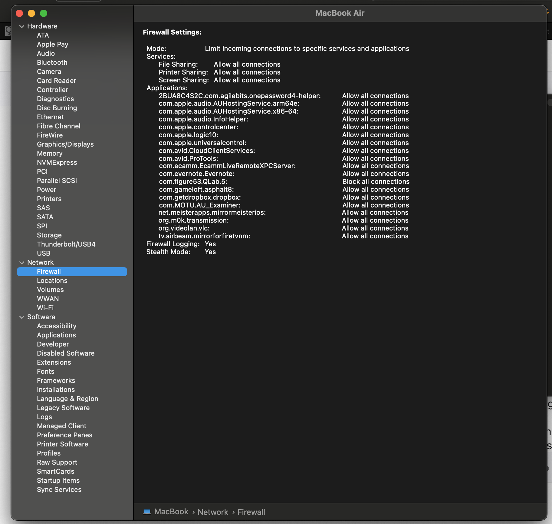 Go to your apple menu on the top left, choose about this Mac/Choose Network, then Firewall..you will see things in there that are NOT at all int he firewalls allow or no list.