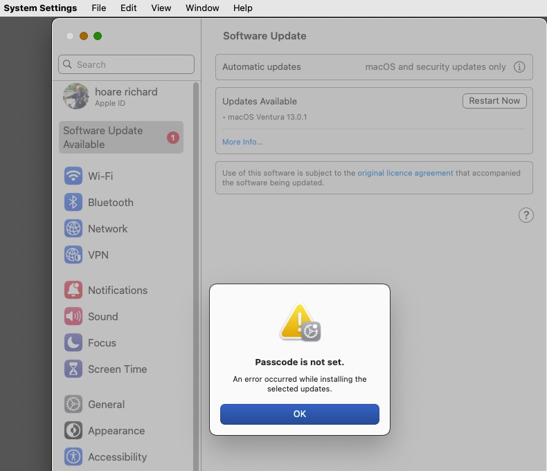 when ever I try to update my Mac to the latest Ventura 13.0.1 update, I get "passcode is not set " error.
