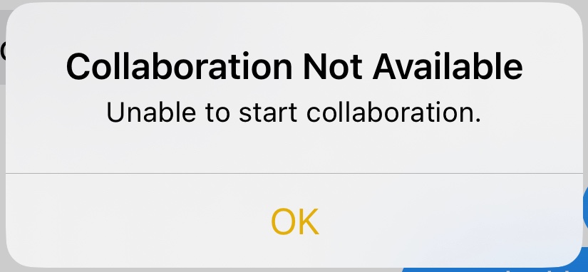 This has worked before, but is now failing. Attempting to share a note with other iPhone users but now I receive an error with states collaboration is unavailable, unable to start collaboration.