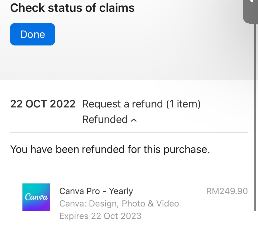 Hi, I requested for a refund for this one subscription on 22 oct. When I checked my status of claim, it said "refunded" and "you have been refunded for this purchase". However, I did not receive any receipts or money in my bank account. The payment method I used for the purchase is debit card.