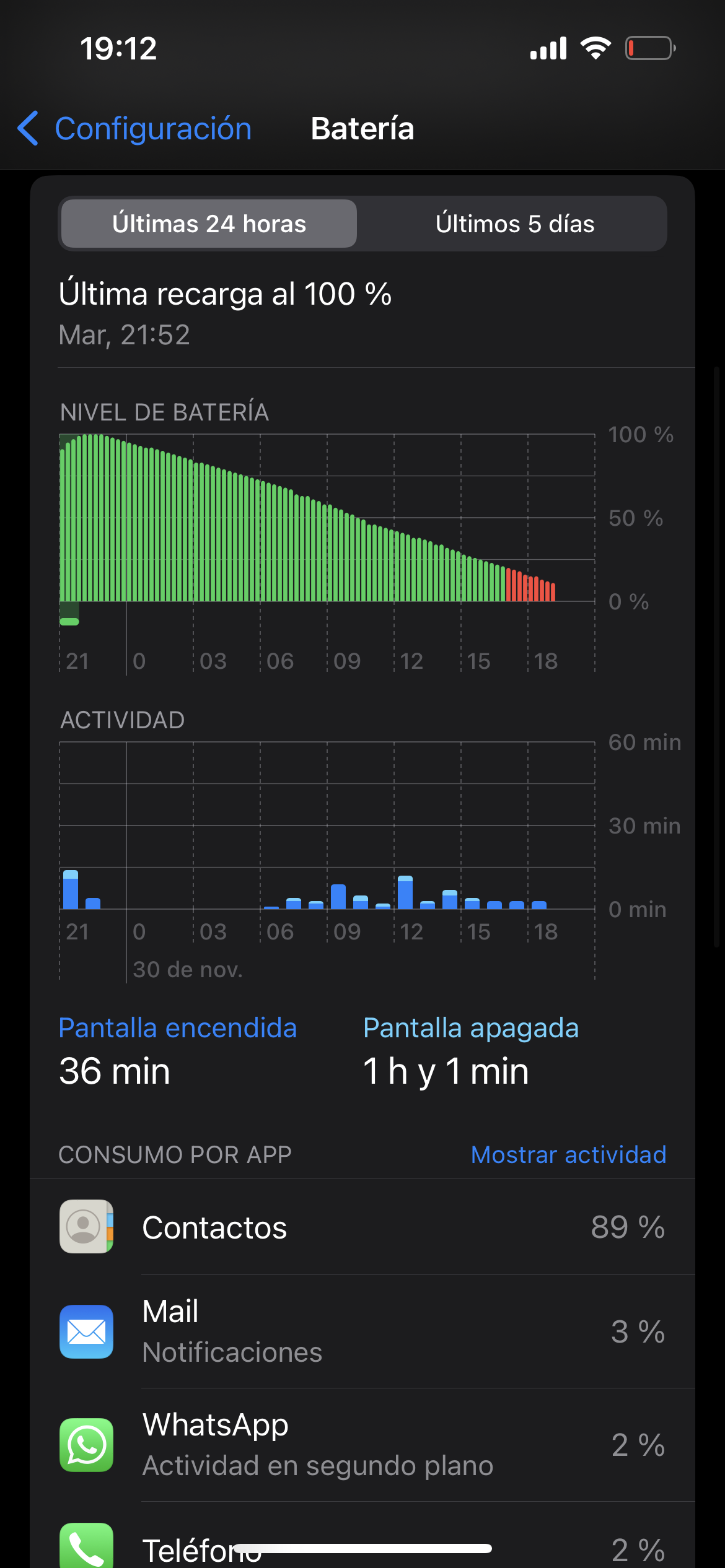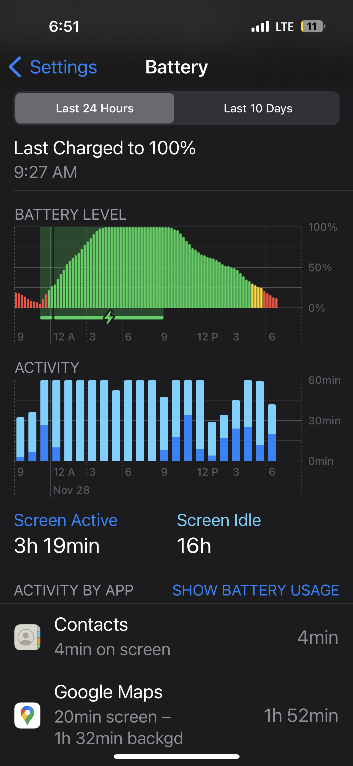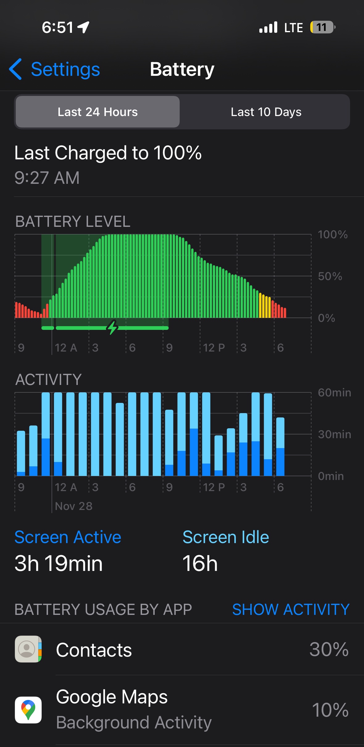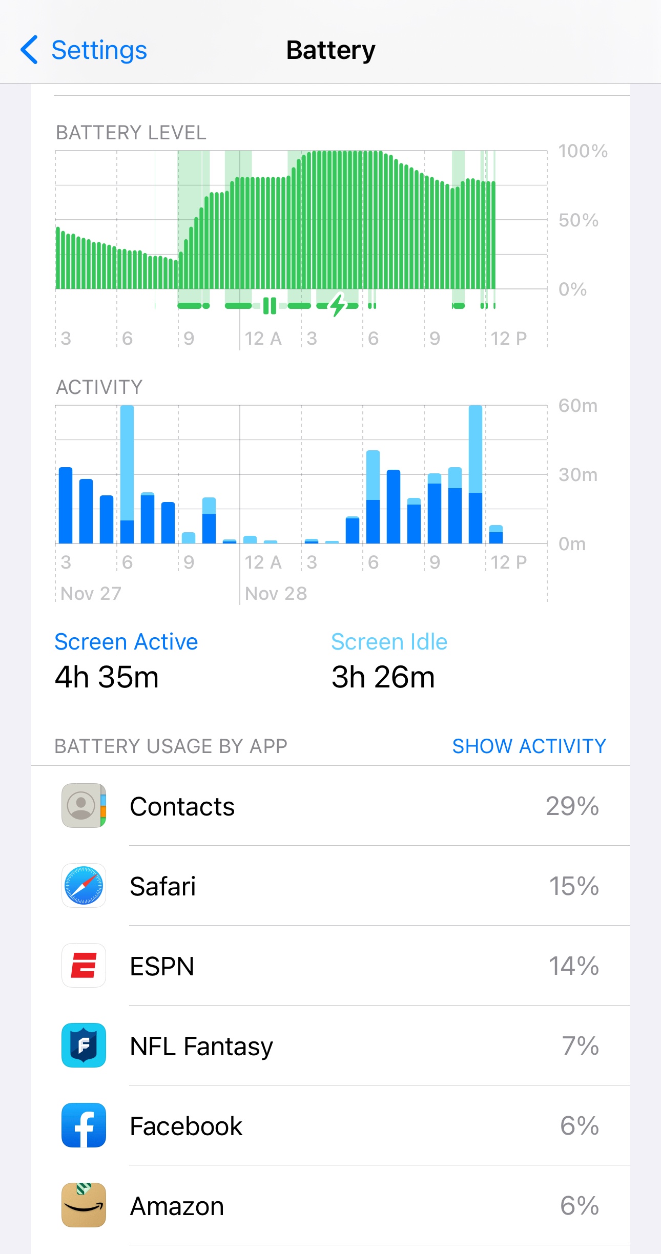 I am having the same issue even with Low Power mode on. Note in my screen grab that contacts has 4min of on screen use and yet consumed 30% of my battery. I did close the contacts app about mid way through the day. It was consuming 56% when I checked it earlier in the day.