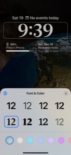 Tap & Hold the Lock screen >> "Customize Wallpaper" >> go to "ADD NEW" hit '+' >> select 'Photos' @ top left >> Tap on image from those available to load image >> Tap on time >> select Font and Colour from "Font & Colour" menu >> Hit Save (at top right of screen)