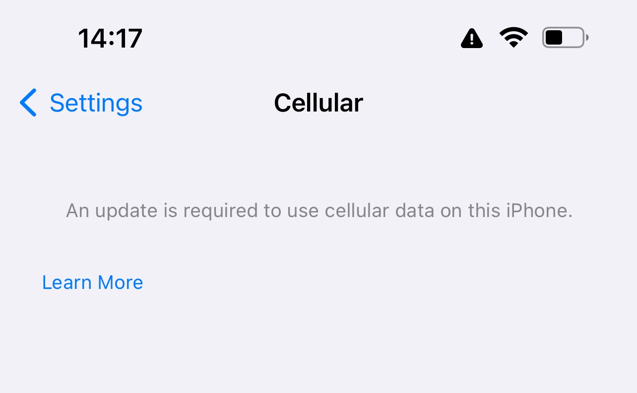Updated to IOS16.1.1 last night. After finishing updating, system shows there is a cellular problem. There is a triangle warning sign at the top right corner next to wifi sign.