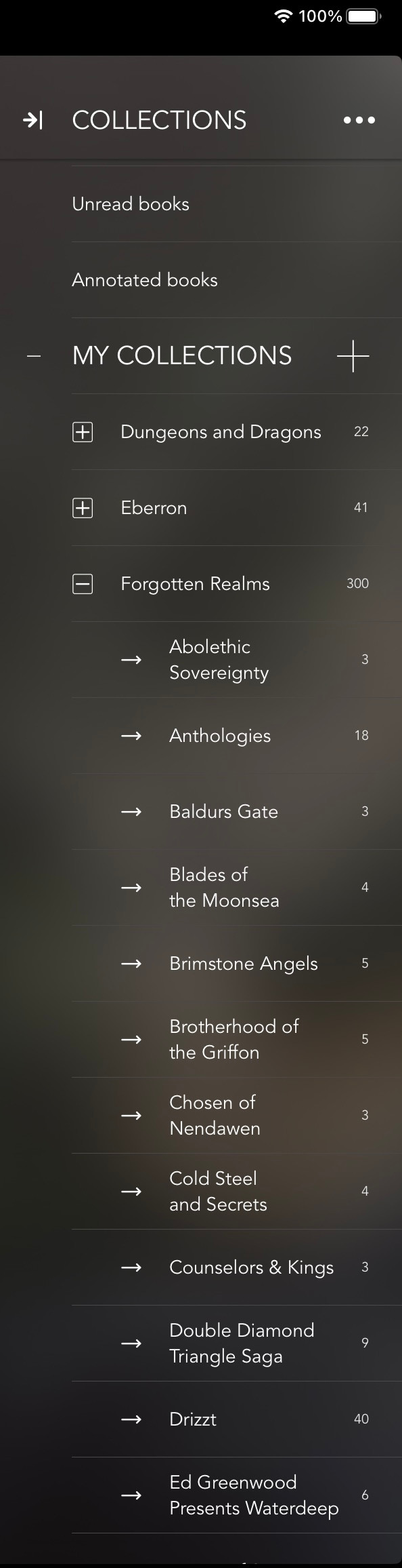 Heck they can't even make it so you can organize your library into sub-categories either such as main being say like WAR with subs underneath such as World War I, World War II, War of 1812, etc. Nothing is more annoying to have tons of books of different categories all into one. Sure you can make separate collections but then you would have A LOT of collections listed. I mean look how a simple app such as Bookari lets you do what you want with subcollections. What is SO hard about setting up Books like this? This feature WOULD make Books a SOLID app to have.