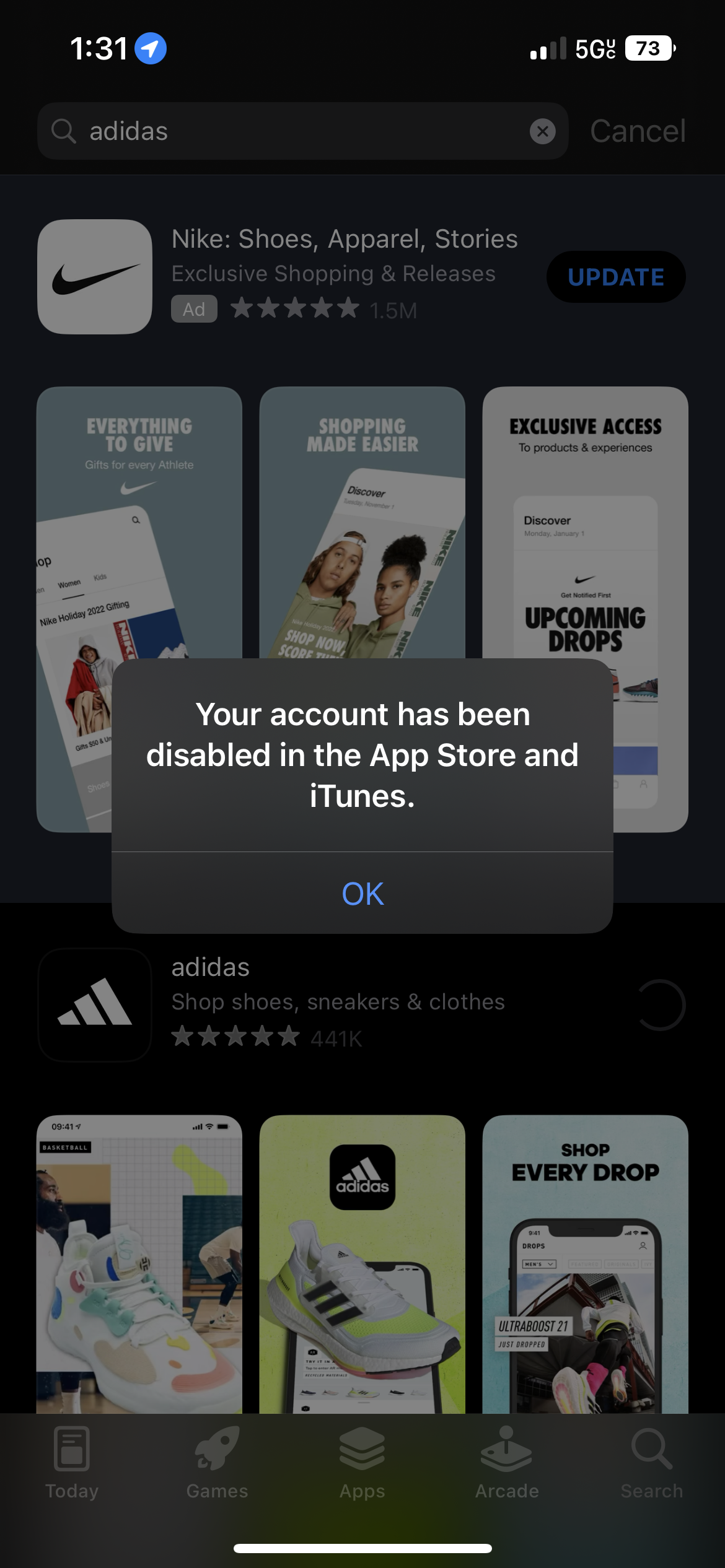 If you see a message that says "Your account has been disabled in the App Store and iTunes", there is a problem with your payment method on your account, to resolve the problem you need help from Apple support, click -> contact Apple Support for help.